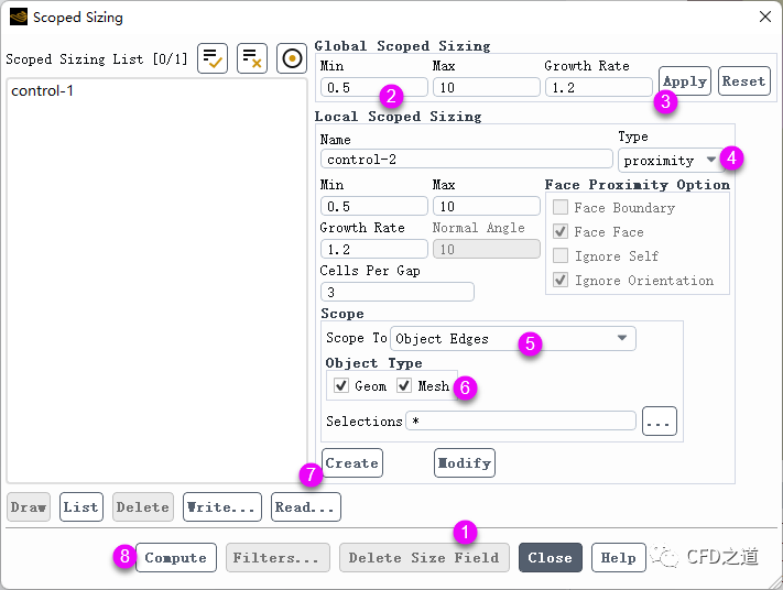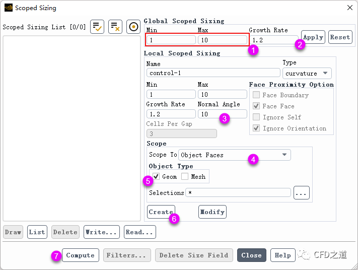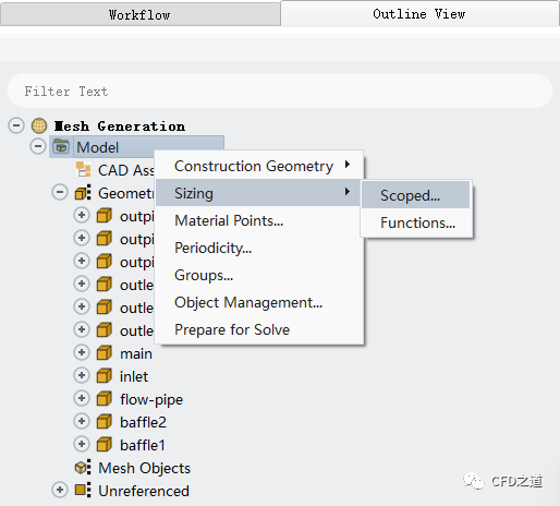 右键选择模型树节点 Model,点击弹出菜单项Sizing → Scoped… 打开设置对话框