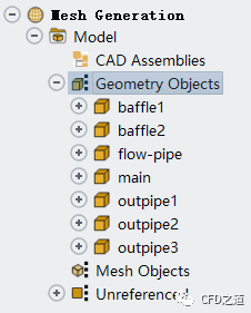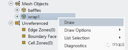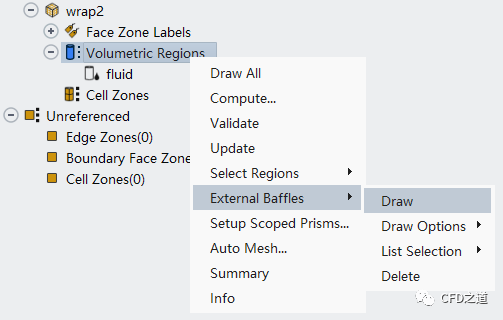 右键选择模型树节点 Volumetric Regions,点击弹出菜单项External Baffles → Draw 显示外部挡板
