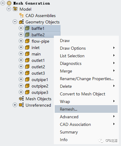 选择模型树中的两个挡板,点击菜单项Remesh… 打开重构对话框