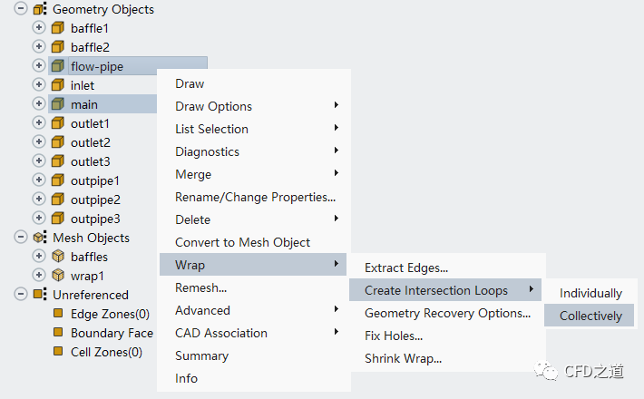 选中模型树节点 flow-pipe及main,点击弹出菜单项Wrap → Create Intersection Loops → Collectively