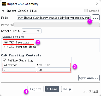 利用菜单File → Import → CAD… 打开文件导入对话框,如图所示导入几何模型(模型下载链接见文末)