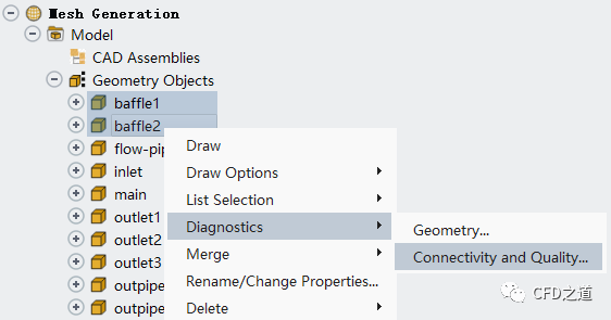 同时选中挡板baffle1与baffle2,点击右键菜单项Diagnostics → Connectivity and Quality...