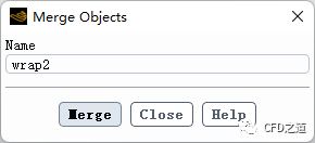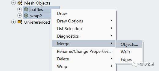右键选择模型树节点 baffles与wrap2,点击弹出菜单项Merge → Objects… 打开设置对话框