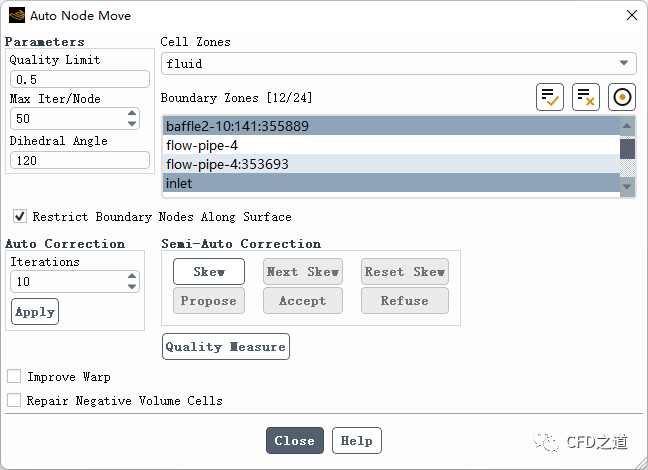 右键选择模型树节点 fluid,点击弹出菜单项Auto Node Move… 打开设置对话框