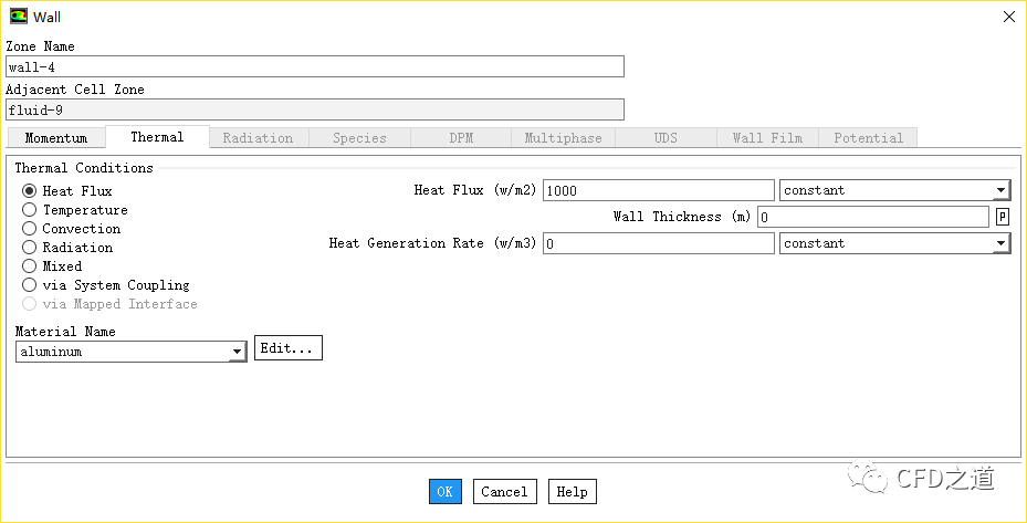 鼠标双击模型树节点Boundary Conditions > wall-4,弹出对话框中切换至Thermal标签页,设置Heat Flux为1000 w/m2