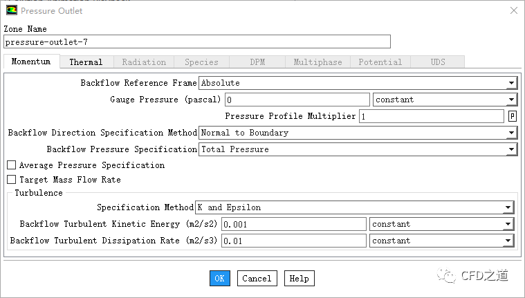 设置出口边界pressure-outlet-7的出口表压为0 pa,湍动能为0.001 m2/s2,湍流耗散率为0.01 m2/s3