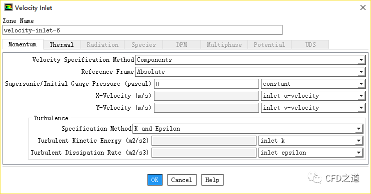 设置边界velocity-inlet-6的入口速度及湍流条件,如下图所示