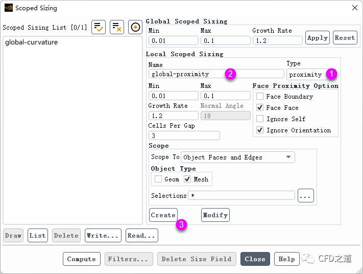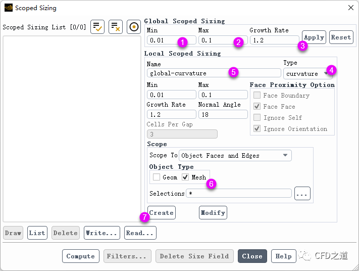 右键选择模型树节点 Model,点击弹出菜单项Sizing → Scoped… 打开设置对话框