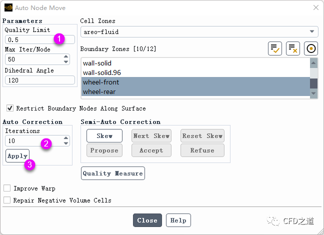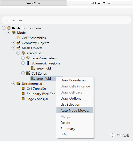 右键选择模型树节点 areo-fluid,点击弹出菜单项Auto Node Move… 打开设置对话框