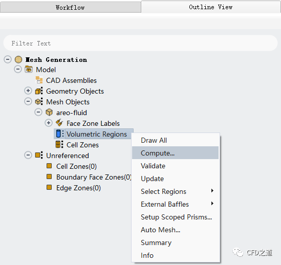右键选择模型树节点 Volumetric Regions,点击弹出菜单项Compute…