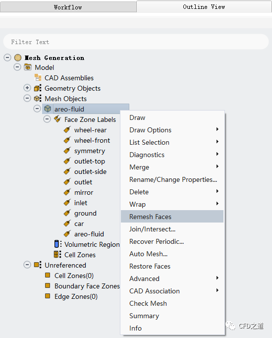右键选择模型树节点 areo-fluid,点击弹出菜单项Remesh Faces 重新划分面网格