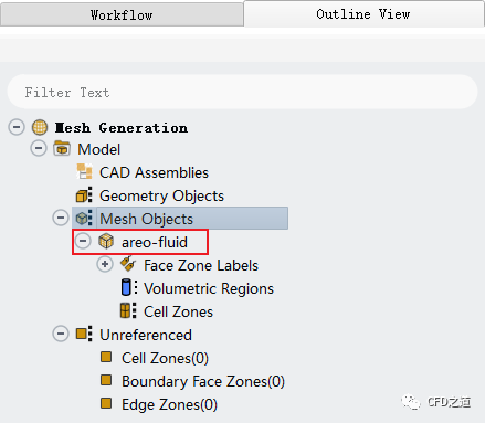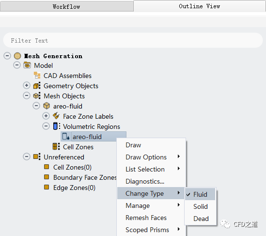 右键选择模型树节点 areo-fluid,点击弹出菜单项Change Type → Fluid 将区域指定为流体域