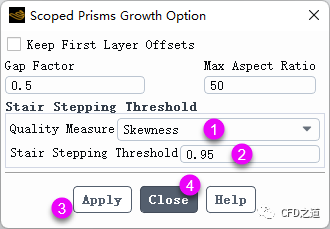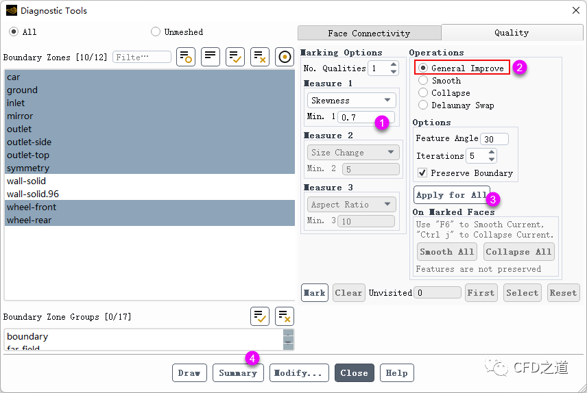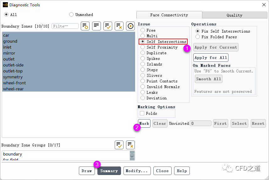 右键选择模型树节点 areo-fluid,点击弹出菜单项Diagnostics → Connectivity and Quality… 打开设置对话框