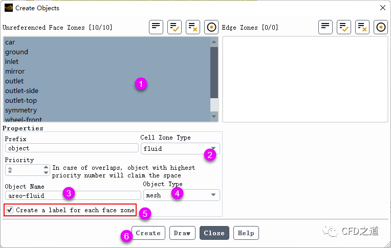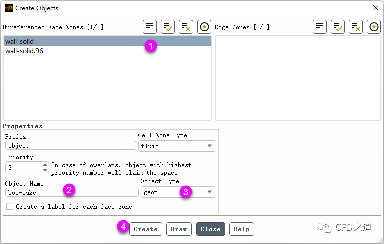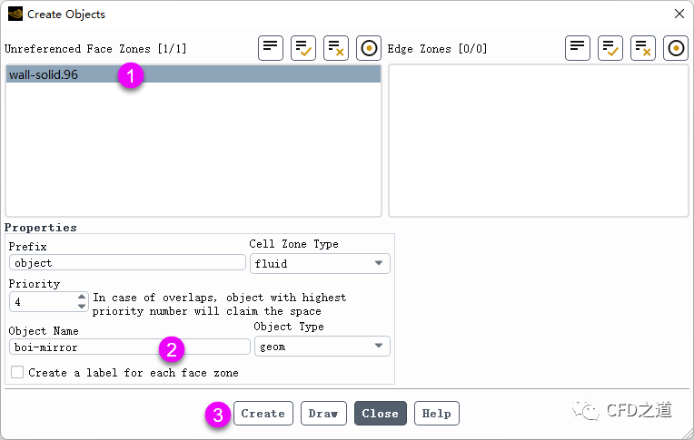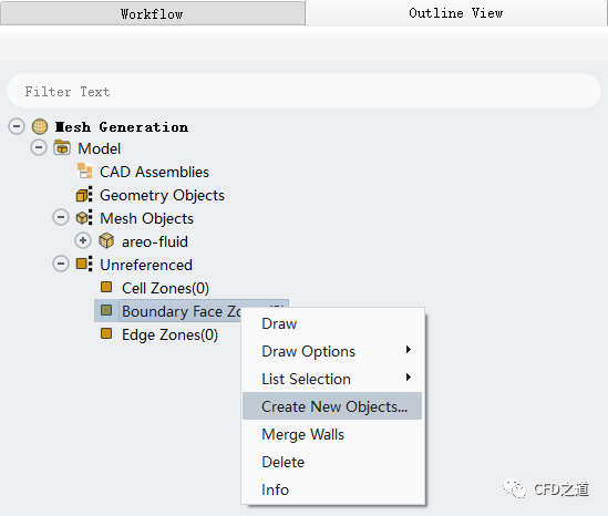右键选择模型树节点 Boundary Face Zones,点击弹出菜单项Create New Objects… 打开设置对话框