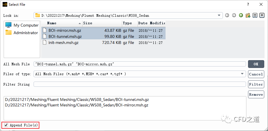 利用菜单File → Read → Boundary Mesh… 导入网格文件B OI-mirror.msh.gz及BOI-tunnel-msh.gz