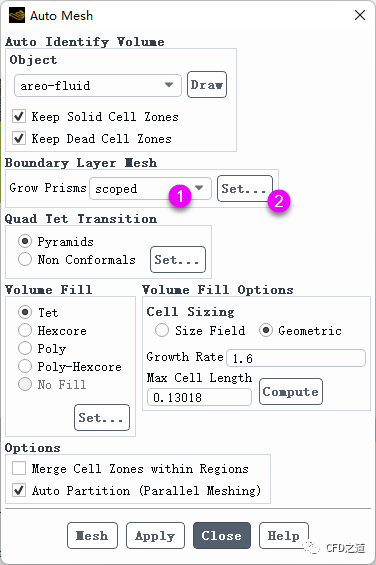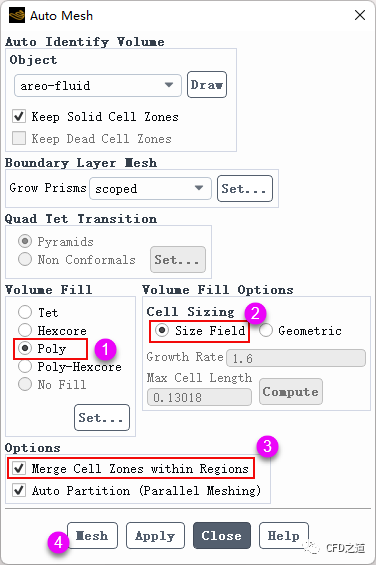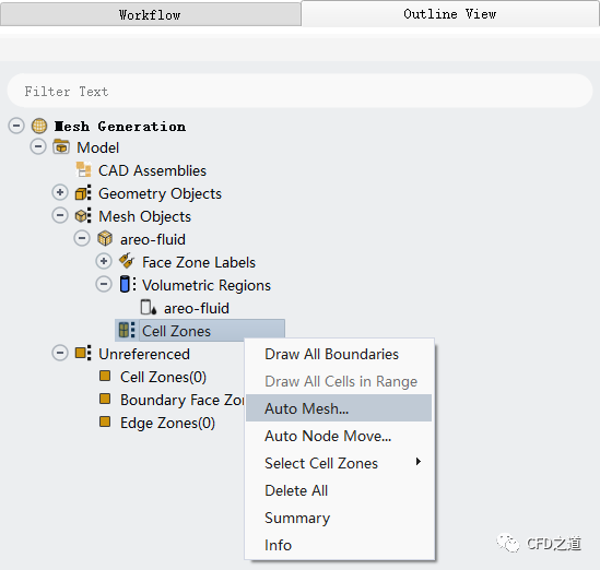 右键选择模型树节点 Cell Zones,点击弹出菜单项Auto Mesh… 打开设置对话框