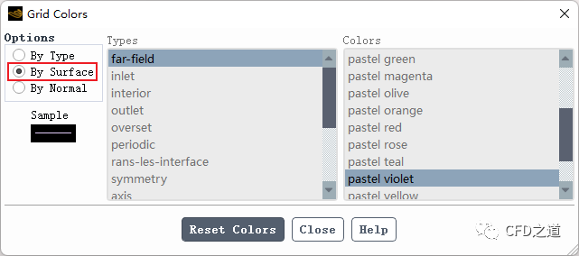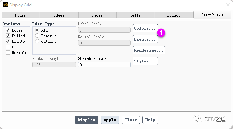 选择菜单Display → Grid… 打开设置对话框,点击 Attributes选显卡中的Colors...按钮打开设置对话框