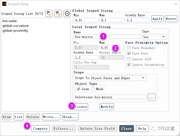 按下图所示顺序及参数创建 boi-mirror并创建尺寸分布