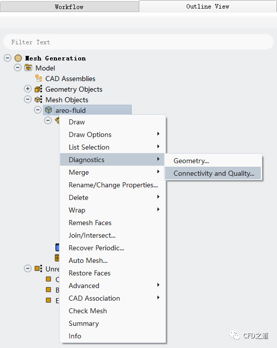 右键选择模型树节点 areo-fluid,点击弹出菜单项Diagnostics → Connectivity and Quality…