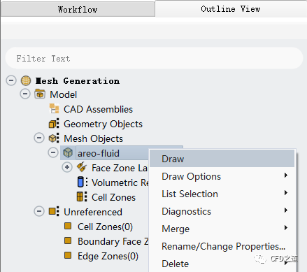 右键选择模型树节点 areo-fluid,点击弹出菜单项Draw显示网格