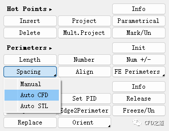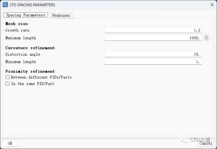 CFD计算对网格有特殊的要求,如需要在大曲率的位置进行加密、网格不能过于稀疏等。ANSA提供了对CFD网格的专门控制选项,其可以通过点击按钮Perimeters > Specing > Auto CFD打开对话框进行设置。