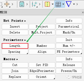 可以利用Mesh面板中的Perimeters > Length按钮可以打开网格尺寸指定对话框。