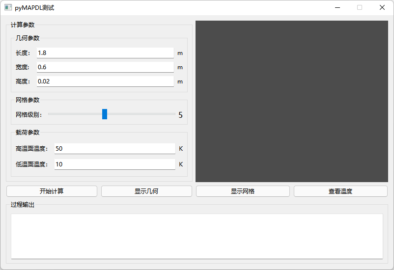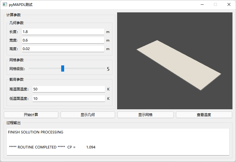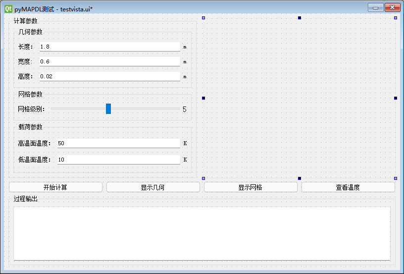 界面没什么好讲的,主要是一些参数输入。这里添加了一个QtIteractor用于在软件中显示vtk。但效果并不好,之前想着是可以将pyMAPDL中的几何、网格及结果显示嵌入到QtInteractor中,但折腾了半天也没搞定,后来采用迂回策略,利用pyMAPDL将几何、网格及结果保存为vtk文件,然后读入vtk文件到QtInteractor中,虽然目标是实现了,但总觉得这种方式不优雅。