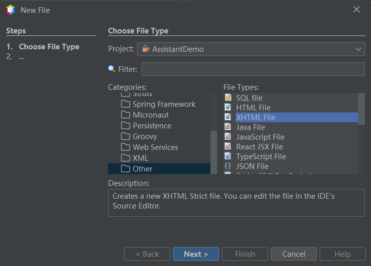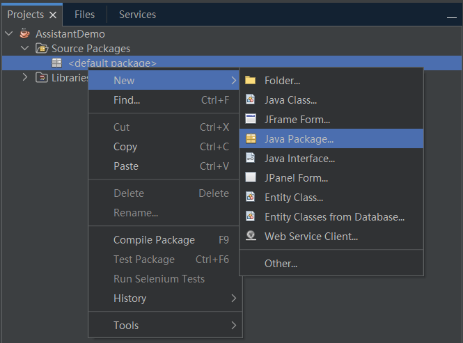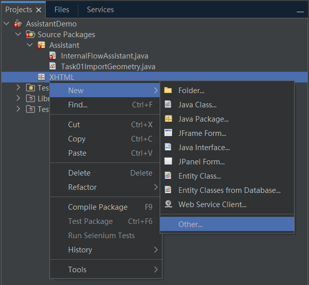 右键选择节点 default package,点击菜单New → Java Package...创建两个包:Assistant及XHTML