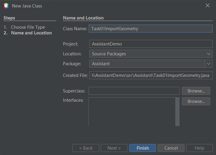 在 Assistant包中添加一个新类,命名为Task01ImportGeometry