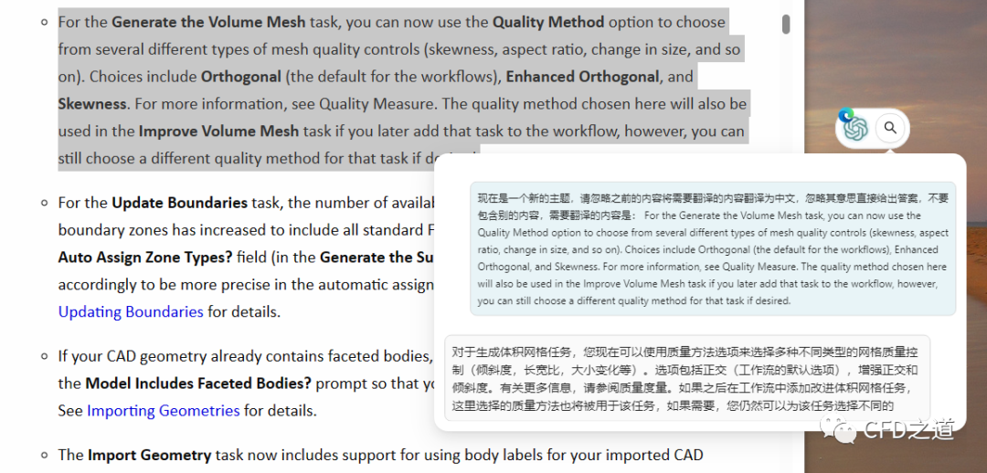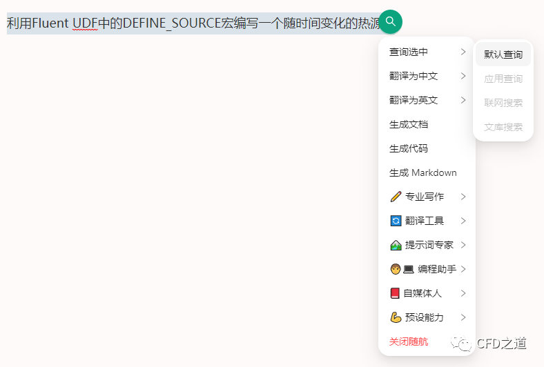 快速利用AI进行查询,可以如下所示。如想要利用AI帮我们写一个随时间变化的热源UDF,可以在文档中写下:利用Fluent UDF中的DEFINE_SOURCE宏编写一个随时间变化的热源。选中文字,点击浮动图标,进入查询,即可利用AI进行相应的查询。