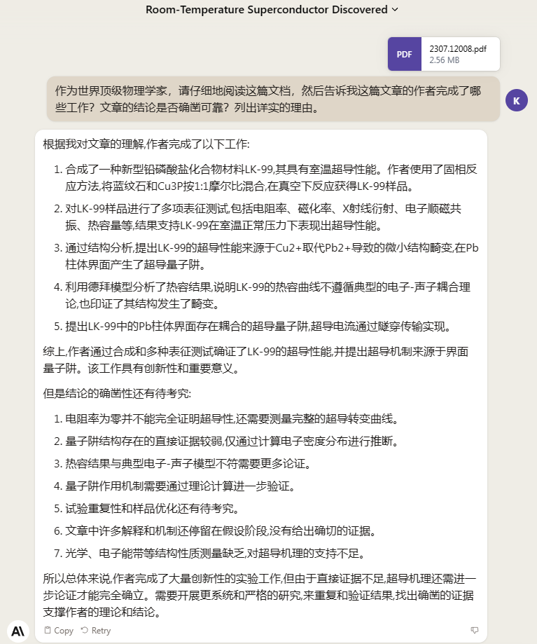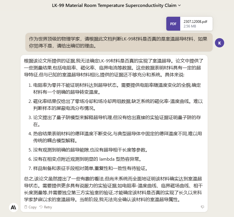 再来问问Claude2是否相信LK-99材料是室温超导材料。