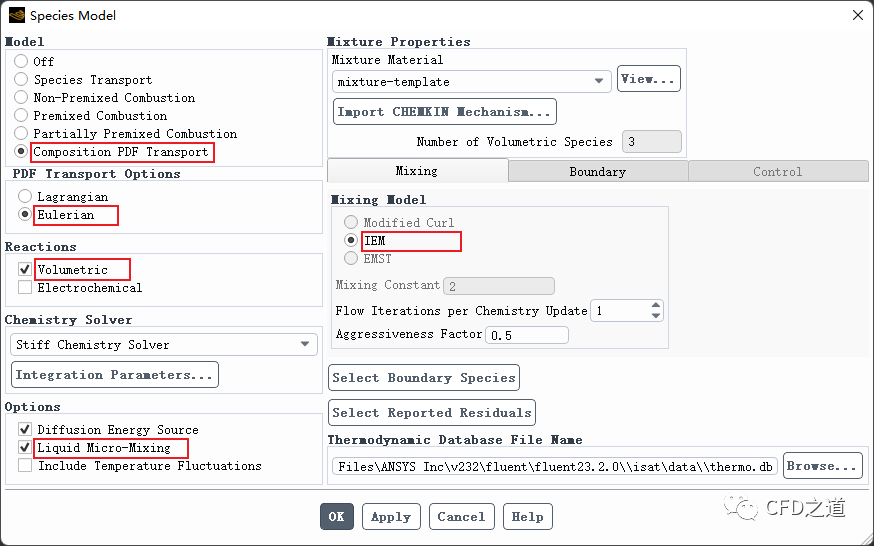 设置具有液相微混合扩展的DQMOM-IEM PDF输运模型。 -