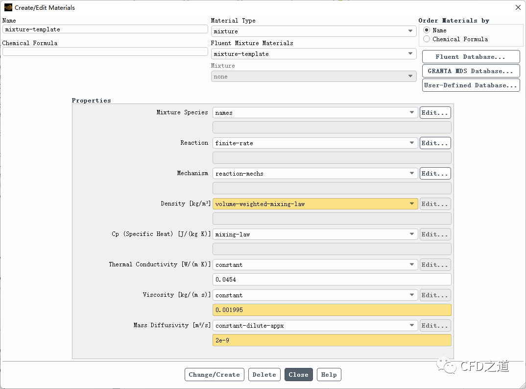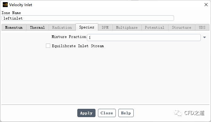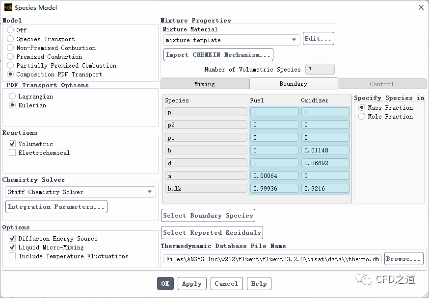 打开Species Model对话框,进入 Boundary选项卡,如下图所示指定燃料及氧化剂质量分数
