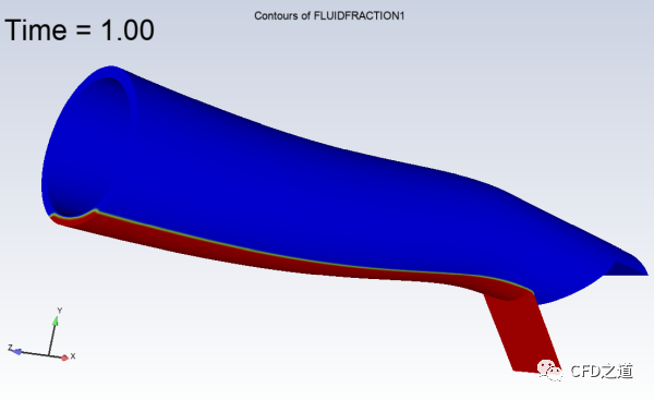 图中可以看到高密度聚乙烯为蓝色,线性低密度聚乙烯为红色。这两种聚合物之间的界面呈绿色。在流体分数变化的区域使用更精细的网格将改善界面位置。