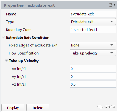 在大纲视图中选择Fluid Boundary Conditions下的extrudate-exit以查看模拟出口边界条件。 -