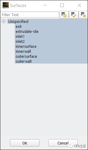 对于Surfaces,选择输入框以打开Surfaces对话框,在其中可以选择相关边界。选择完成后,点击OK以关闭对话框。