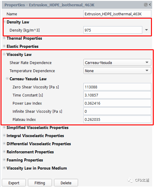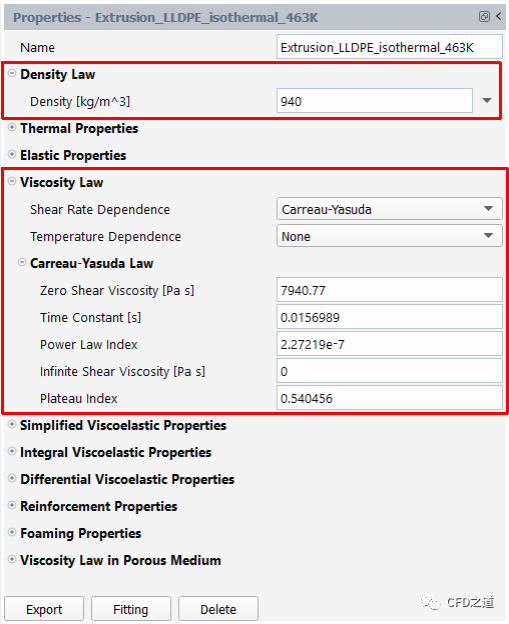 查看第二种材料(Extrusion_LLDPE_isothermal_463K)的密度和粘度设置。