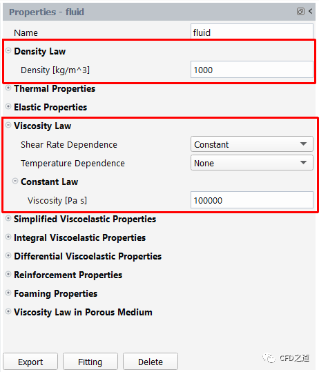 在 Density Law类别中,指定Density为 1000kg/m3。 -