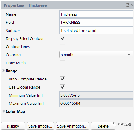 保留其余默认值,然后单击 Display 在图形窗口中查看厚度分布图。