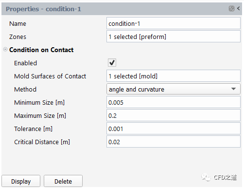 选择模型树节点Setup → Adaptive Meshing → Conditions → condition-1定义自适应网格条件(condition-1)。 -