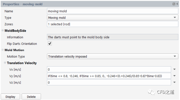 点击 Display 在杆(moving-mold)上可视化箭头。