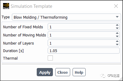 点击按钮Setup → Simulation → Use Template… 打开Simulation Template 对话框设置吹塑模拟 -