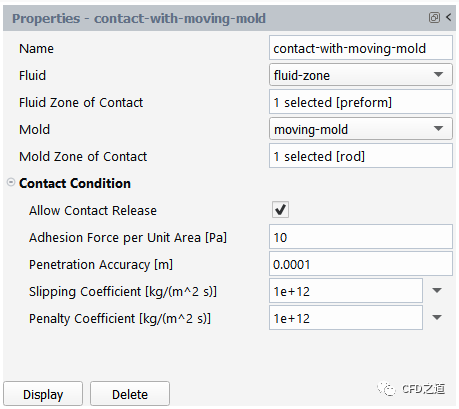 在 Contact Boundary Conditions 下,选择 contact-with-moving-mold以编辑此接触条件的默认属性 -