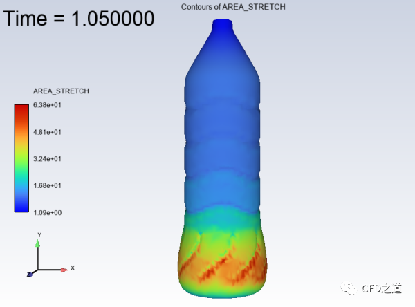 点击Results → Graphics → Contour → New… 显示面积拉伸(AREA_STRETCH)的分布,用于 preform 表面。