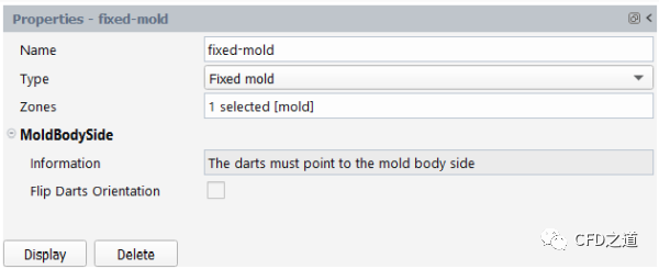 点击 Display 在固定模具上可视化箭头。在 fixed-mold上显示的箭头显示方向指向模具本体侧。