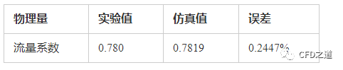 参考文献:【W.H. Nurick, “Orifice Cavitation and Its Effects on Spray Mixing”. Journal of Fluids Engineering, Vol.98, pp. 681-687, 1976】中的实验值与仿真值比较如下表所示:
