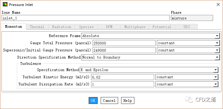 鼠标双击模型树节点Boundary Conditions > inlet_1,如下图所示设置压力条件及湍流条件