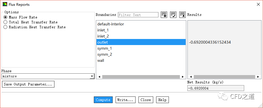 利用Report > Flux统计输出出口的质量流量,如下图所示,出口质量流量为0.692kg/s
