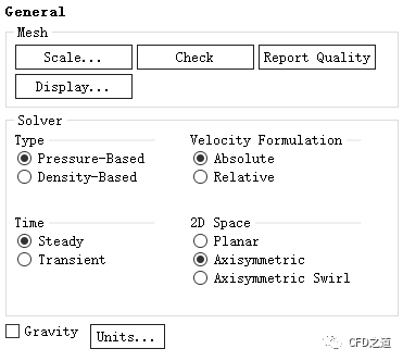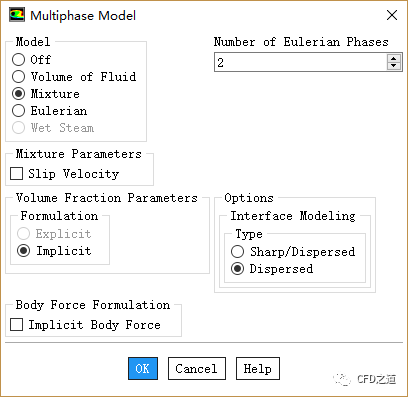 双击模型树节点Models > Multiphase,弹出面板中选择选项Mixture,取消选项Slip Velocity,其他参数保持默认设置