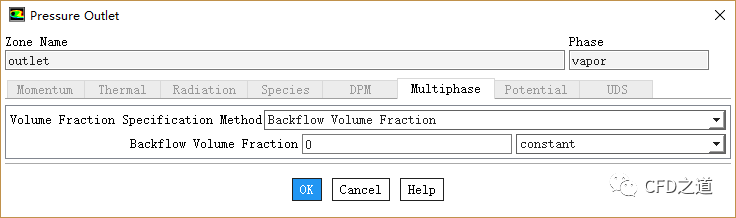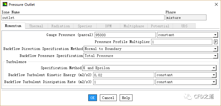 鼠标双击模型树节点Boundary Conditions > outlet,如下图所示设置压力条件及湍流条件